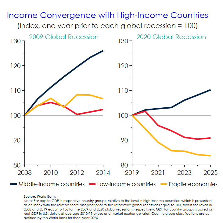- In low-income and fragile economies, the income differential with high-income countries widened by 2025, relative to the gap in 2019, while the differential narrowed during a recovery following the 2009 global recession